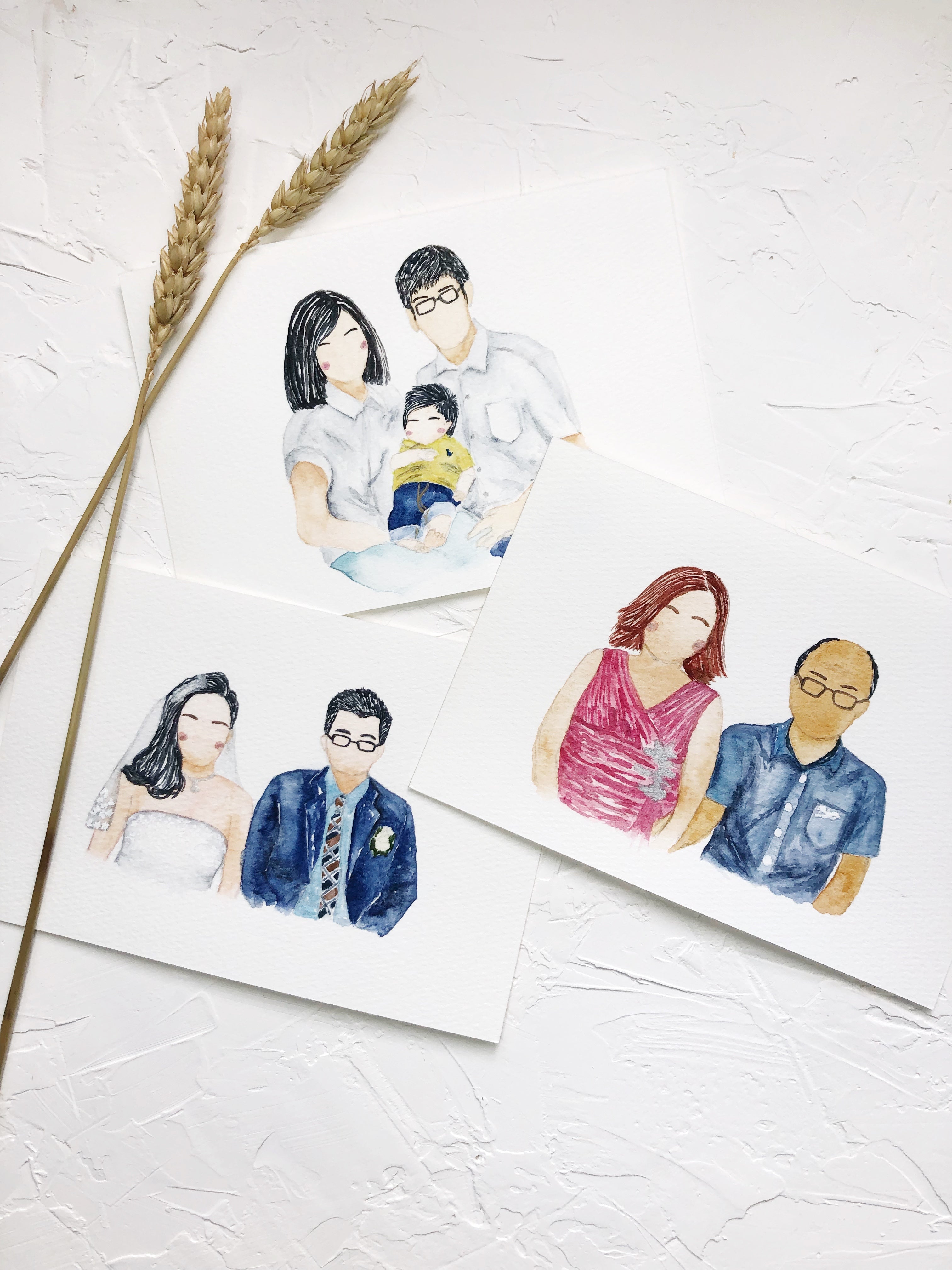 Hand-painted, faceless portraits that capture your memories in dreamy, whimsical watercolour style. Perfect as gifts for couples and families.