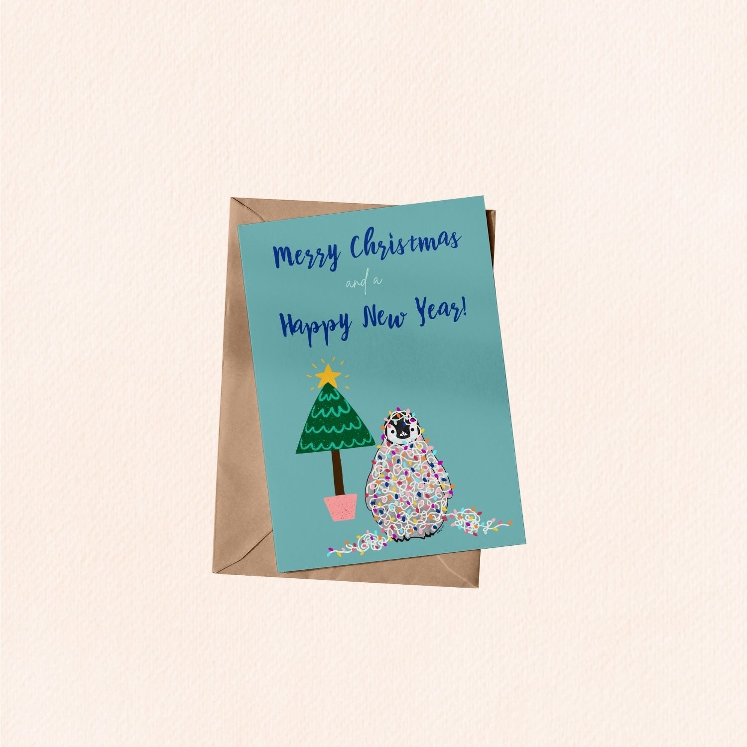 Pudding the Penguin Christmas Lights Christmas Greeting Card
